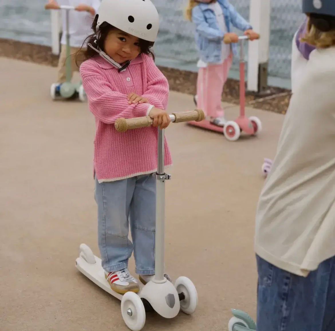 Der Eco Scooter im zeitlosen Look in der Farbe Ivory wird gemeinsam mit dem Eco Helm in passender Farbe geliefert. Der Scooter ist so konzipiert, dass er dank verstellbarem Lenker mit deinem Kind mitwächst. Er fördert Körpergefühl, Gleichgewicht und Koordination deines Kindes und eignet sich ab 3 Jahren.
